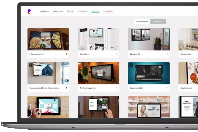 Для показа контента — телевизоры, планшеты или специальные цифровые панели: используйте свои или приобретите у нас
